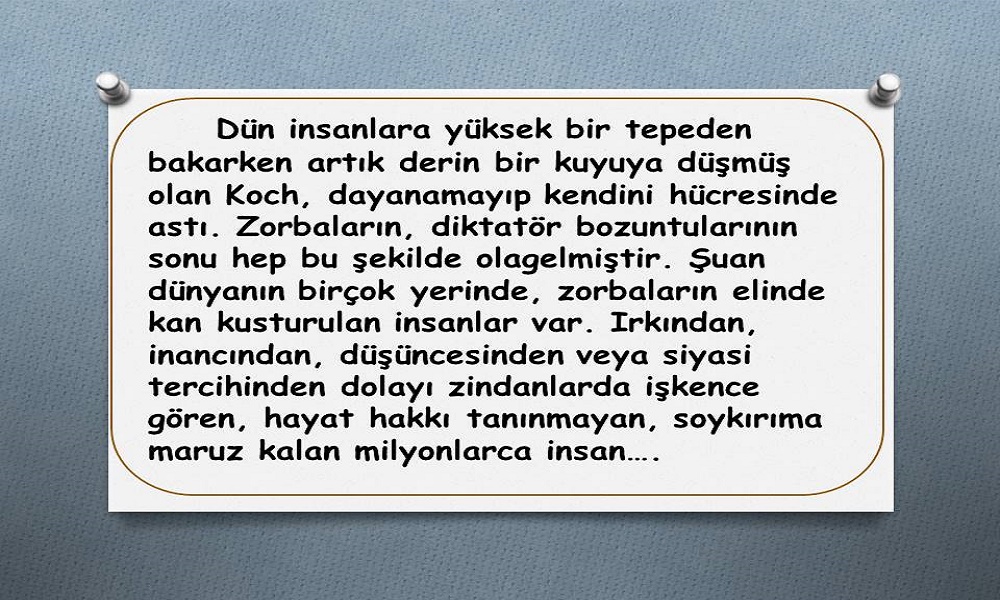 bakarken artık derin bir kuyuya düşmüş olan Koch, dayanamayıp kendini hücresinde astı. Zorbaların, diktatör bozuntularının sonu hep bu şekilde olagelmiştir. Şuan dünyanın birçok yerinde, zorbaların elinde kan kusturulan insanlar var. Irkından, inancından, düşüncesinden veya siyasi tercihinden dolayı zindanlarda işkence gören, hayat hakkı tanınmayan, soykırıma maruz kalan milyonlarca insan…. Bir de bu acıları onlara çektiren, bunu yaparken de Koch gibi onları insan olarak görmeyen, belki zevk için, belki başındaki zorbalardan korktukları için, belki de bütün ruhunu saran kin duygusundan dolayı veyahut bir avuç dünyalık için yapıyorlardır. Ölümden sonrası hayata inançları vardır veya yoktur ama içlerindeki susturmuş oldukları vicdanları mutlaka bir gün onlara soracaktır; değer miydi?